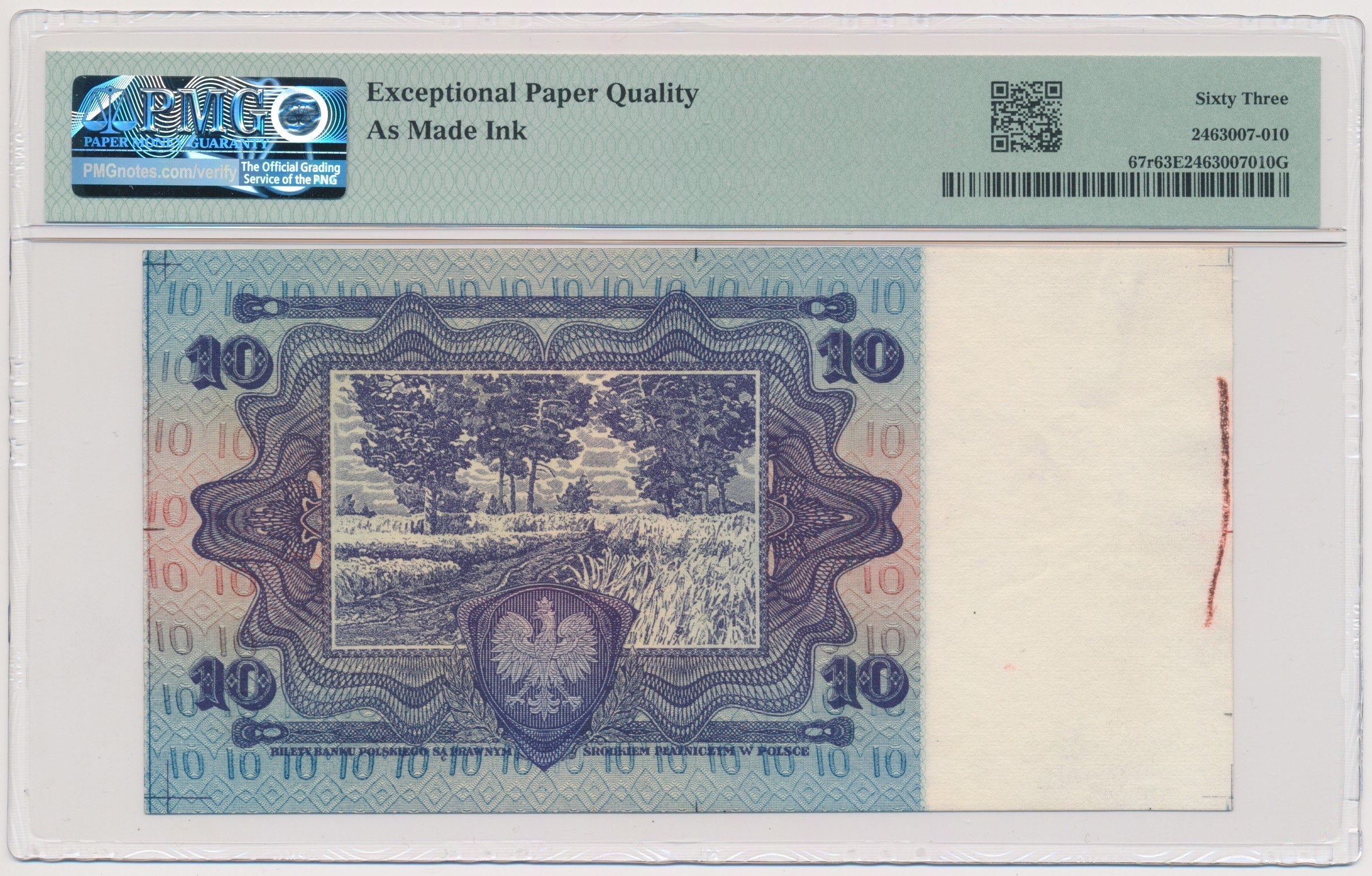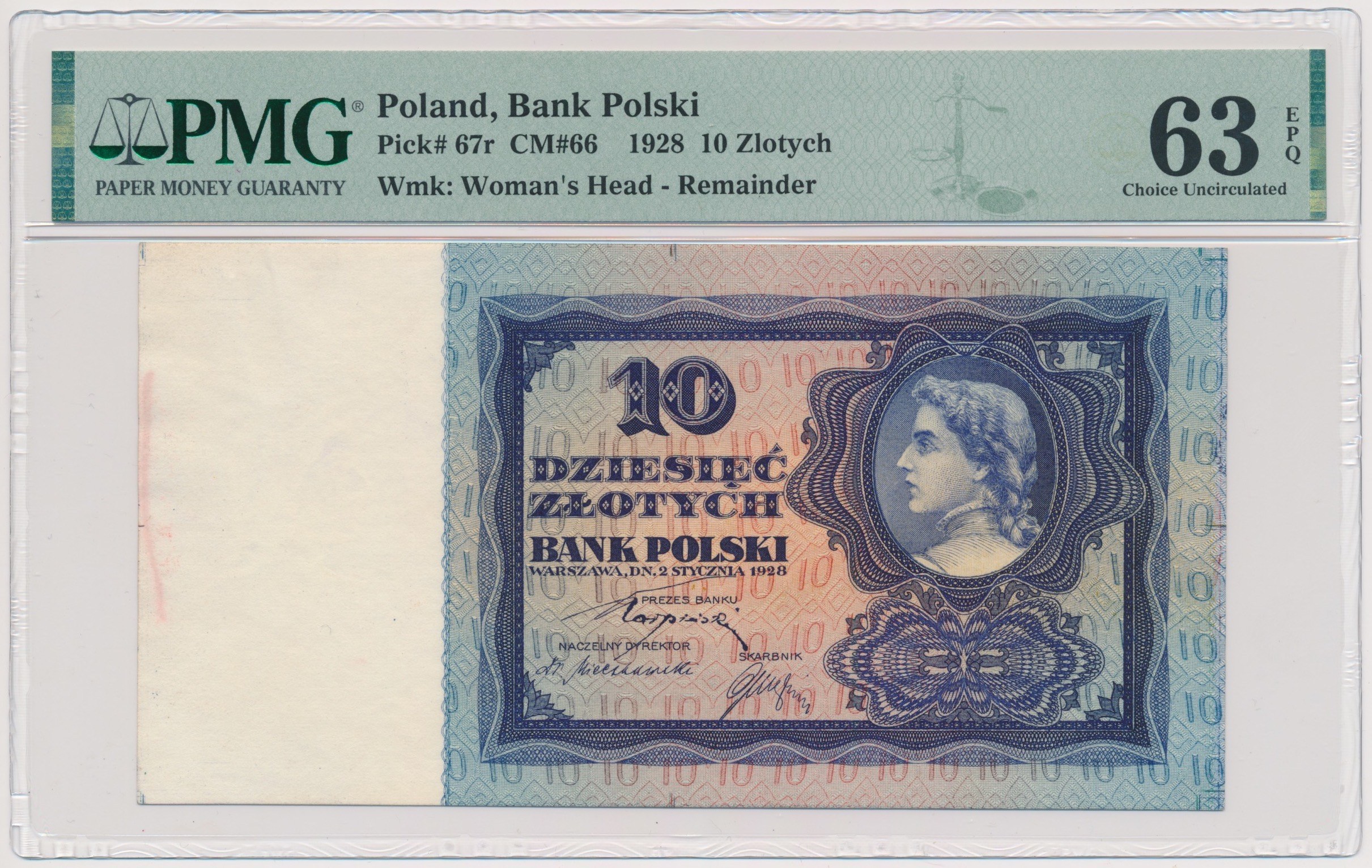 10 złotych z 1928 roku to banknot, który nigdy nie został wprowadzony do obiegu, a jego nieliczne, znane obecnie egzemplarze pochodzą z wstępnej partii prezentacyjnej i stanowią obiekt największego pożądania kolekcjonerskiego