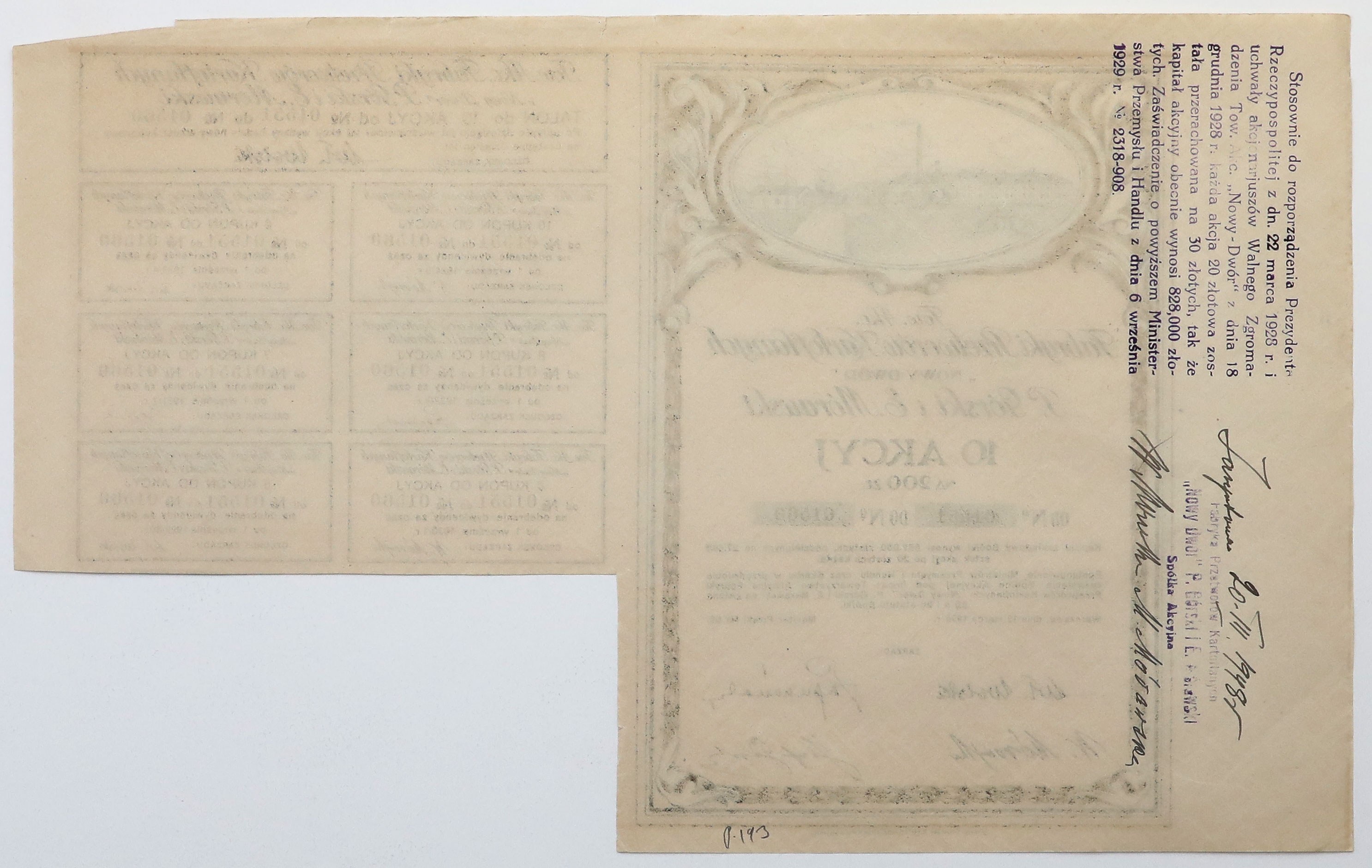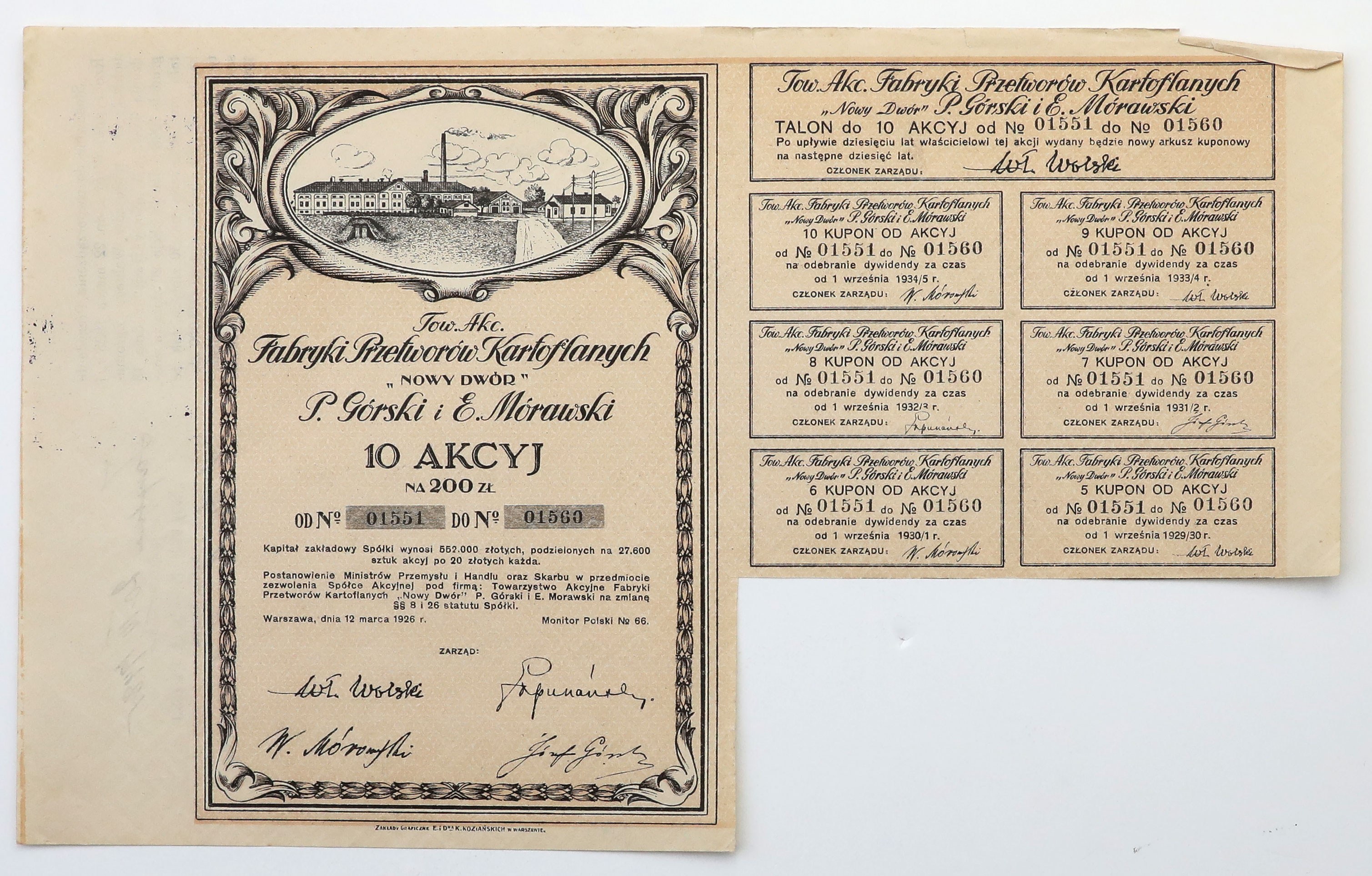 Tow. akcyjne Fabryki Przetworów Kartoflanych NOWY DWÓR P. Górski and E. Morawski, 10x 20 zl 1926