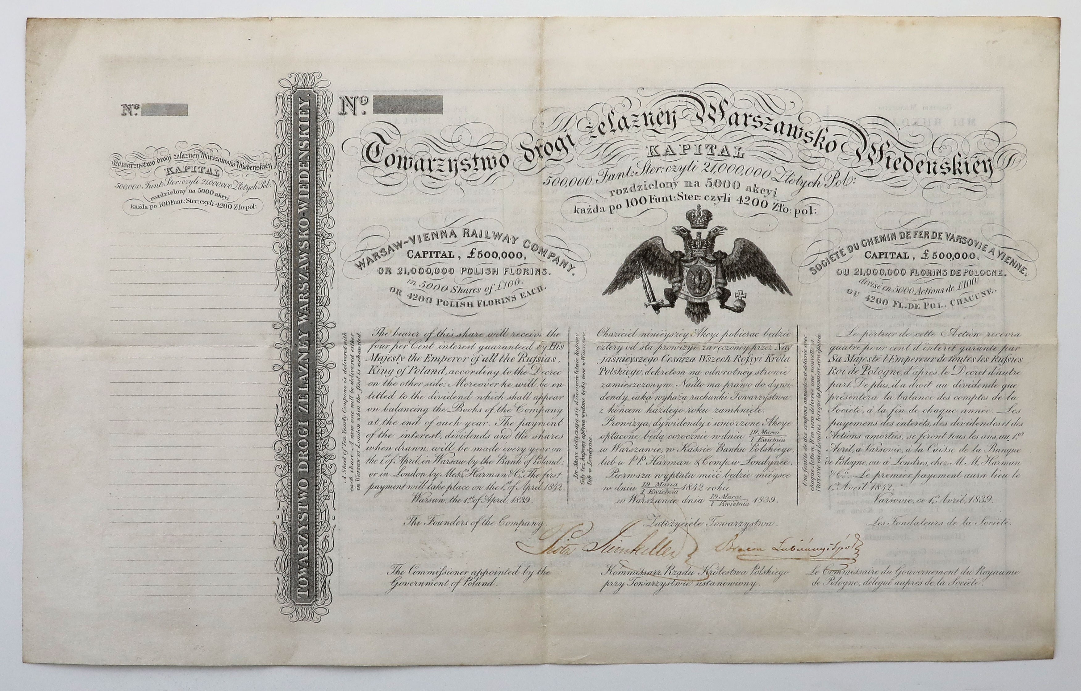 First Stock of the Warsaw-Vienna Iron Road Society, issued April1 , 1839. Highdenomination of 100 pounds sterling = 4,200 zlotys.