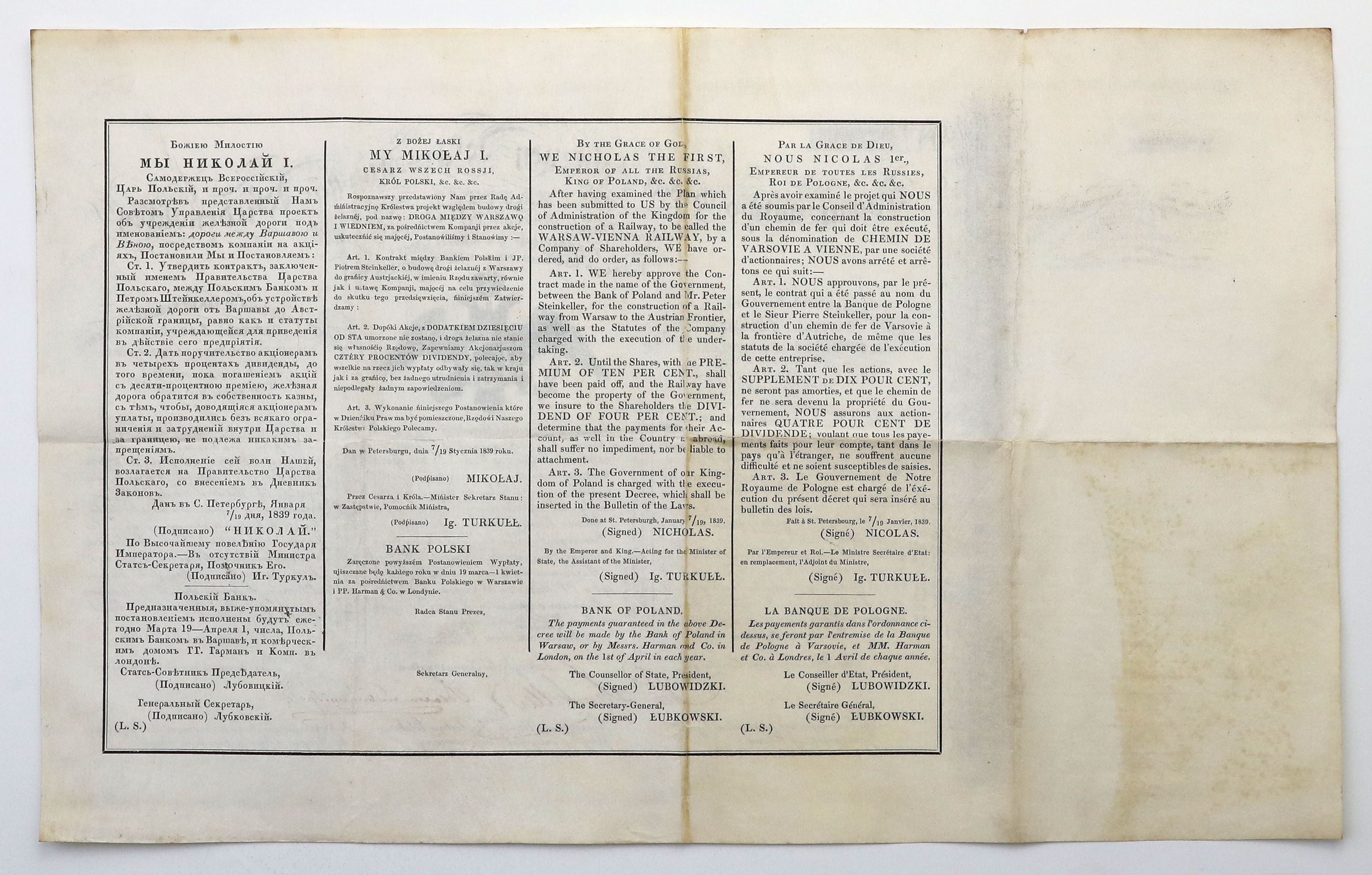 The second signature belongs to a representative of the Commercial House of the Łubieński Brothers and Company in Warsaw, as the director of the construction of the Warsaw-Vienna Railway was one of the members of this aristocratic family - General Count Tomasz Łubieński.