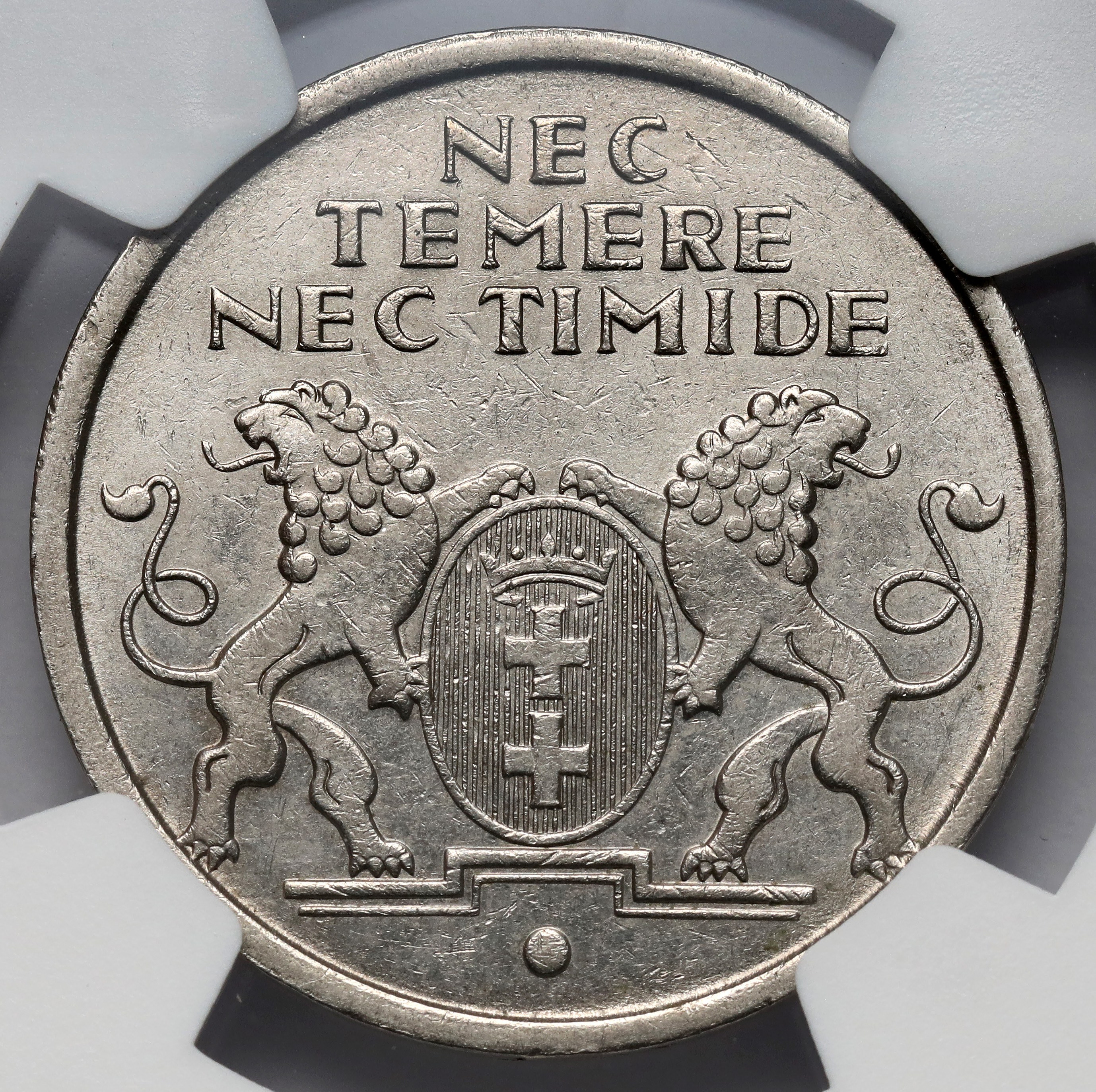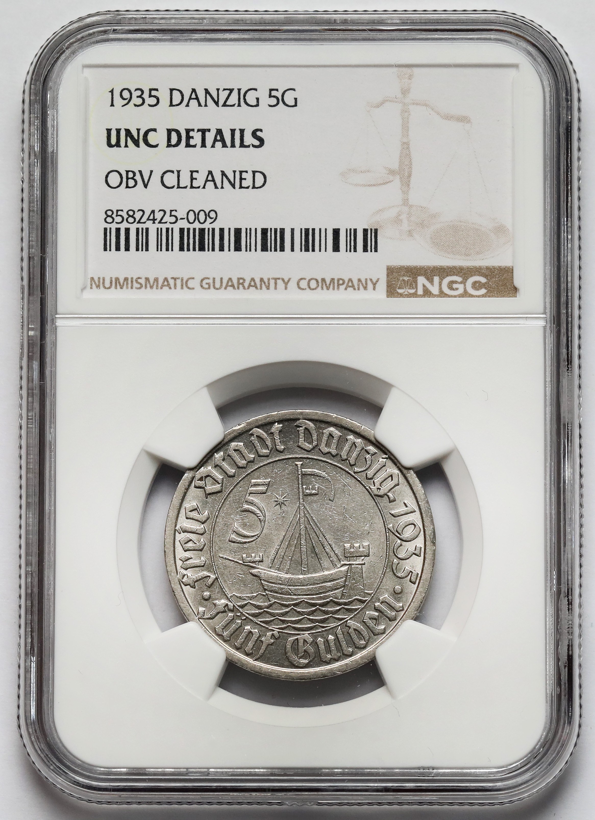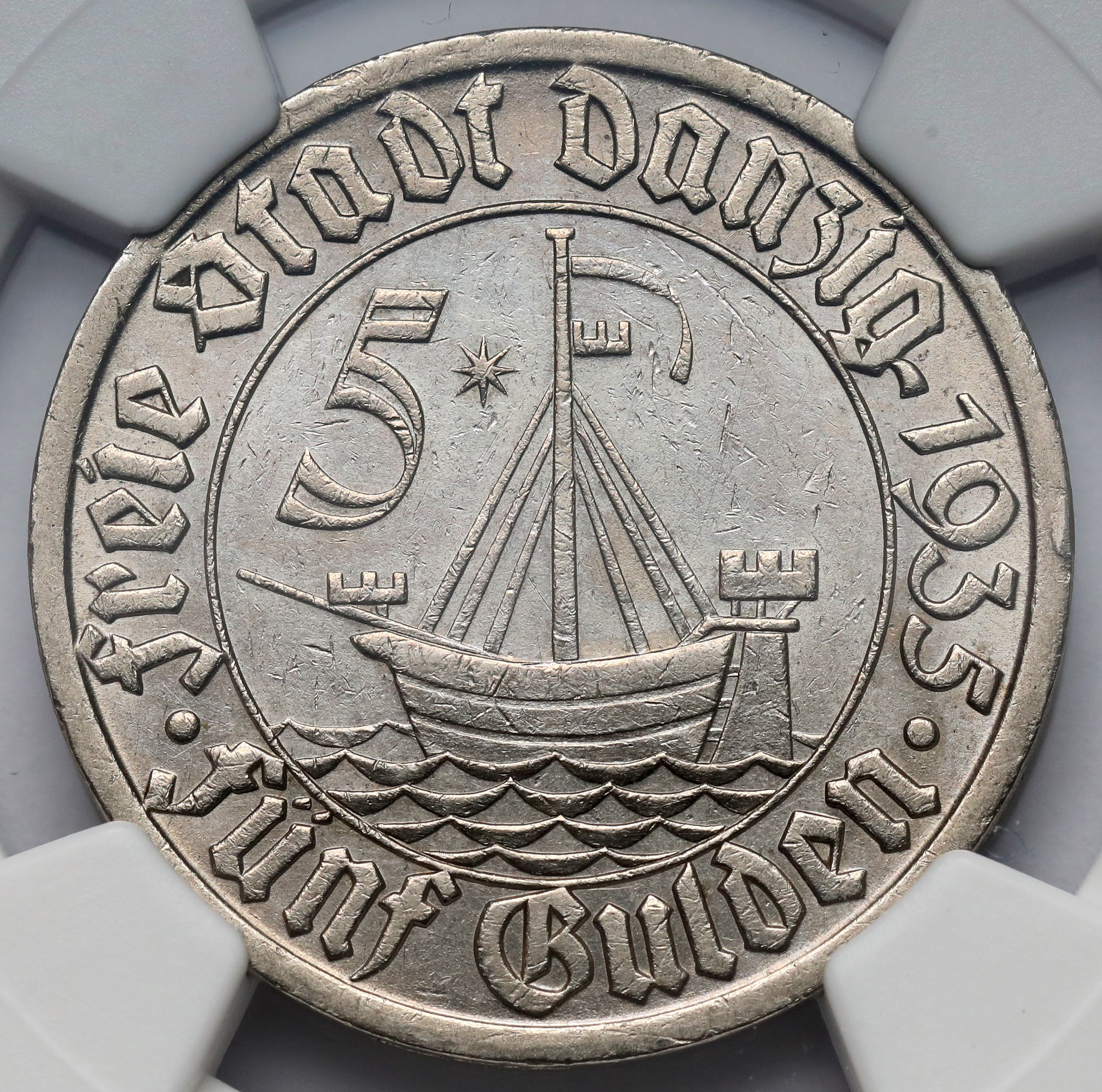 L'ultima annata dei cinque fiorini di Danzica, con il Koga al rovescio.
