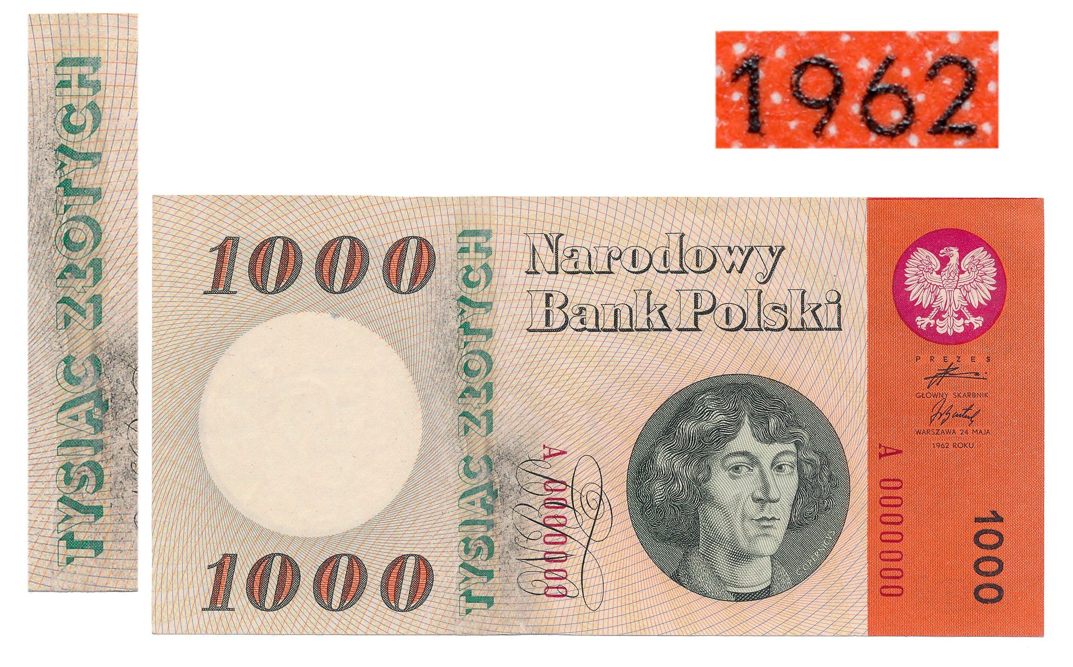 1.000 złotych 1962 - A 0000000 - egzemplarz PO CZERWONYM PASKU