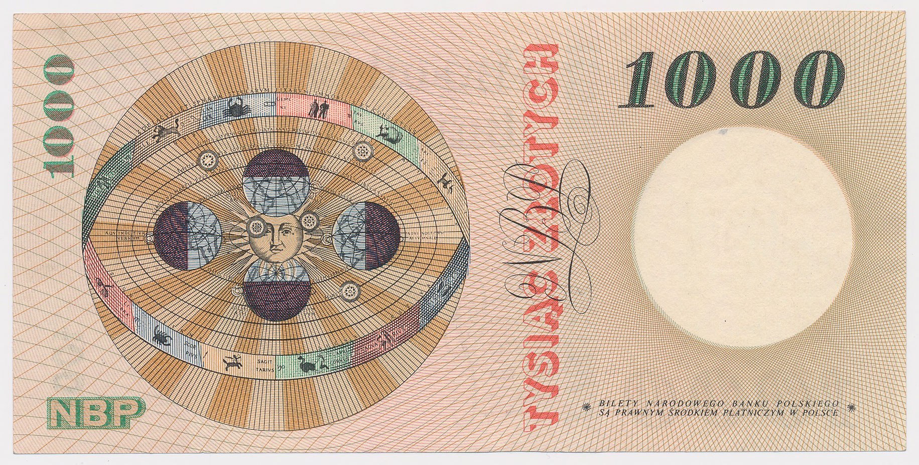 Na wydrukowanym banknocie w okolicy środka widnieje wyraźny, zielony napis TYSIĄC ZŁOTYCH. Wszechobecnym w czasach PRL kolorem, ze względów ideologicznych, był jednak kolor czerwony. I choć banknot 1000 złotych z Kopernikiem zdominowany jest przez czerwień, to próbowano czy nie da się jej przemycić tu jeszcze więcej.