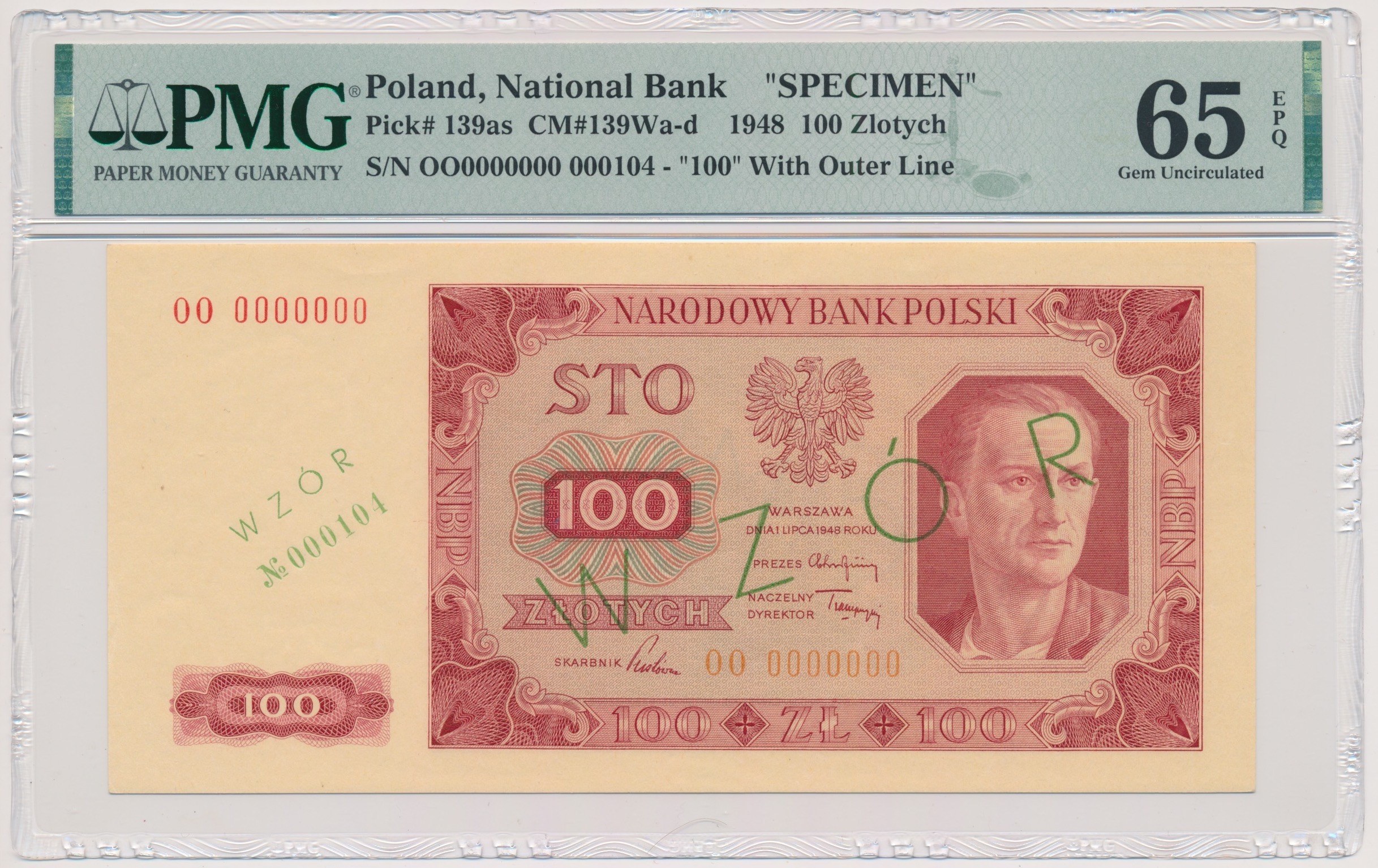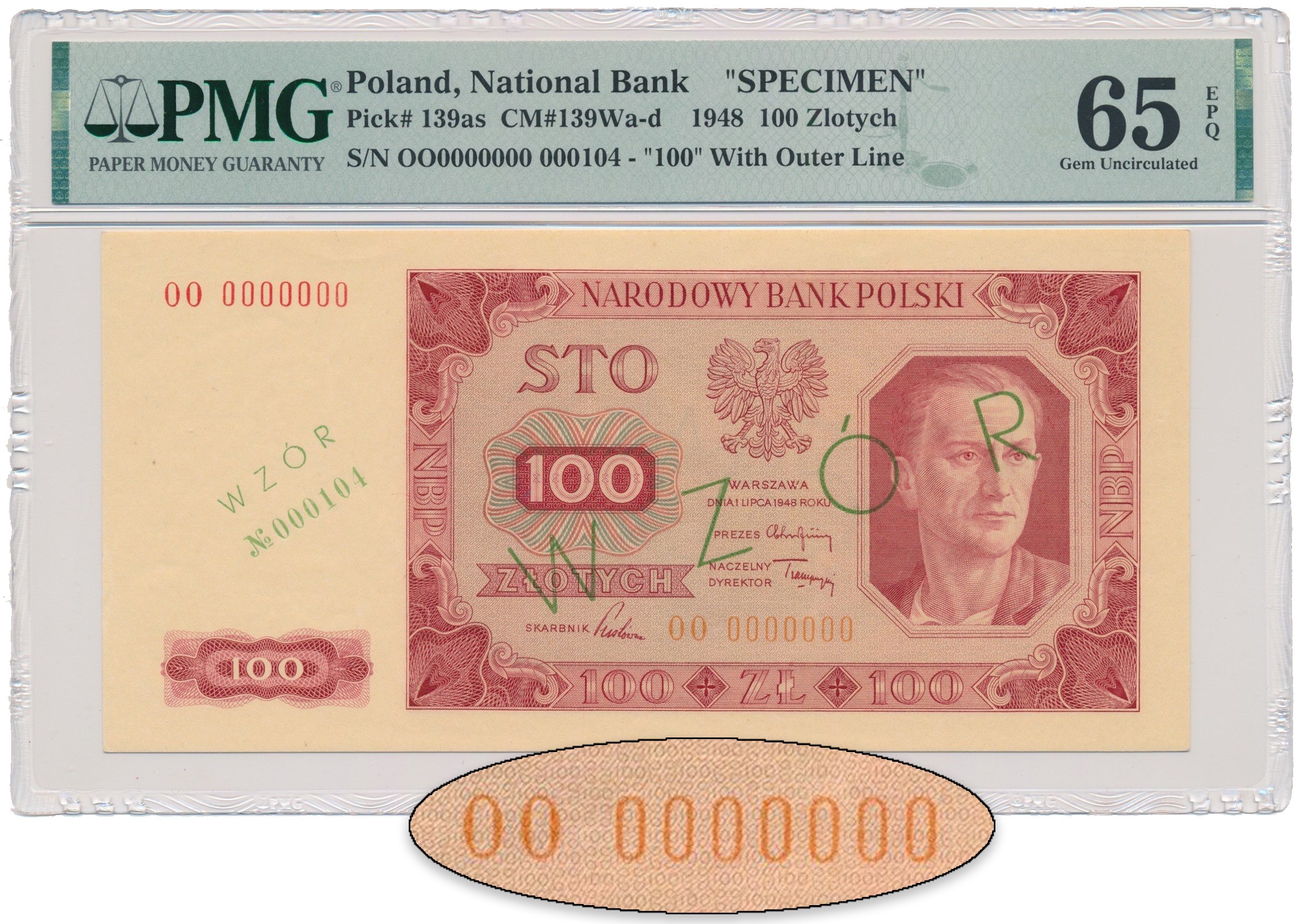 To walor wyróżniający się zarówno zielonym nadrukiem WZÓR (zamiast typowego dla kasowych napisu SPECIMEN) i numerem własnym wzoru w lewym polu banknotu (WZÓR No 000104).