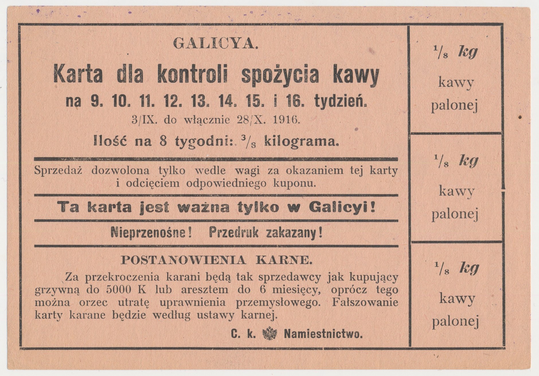 Galicja, Karta kontroli spożycia kawy 1916