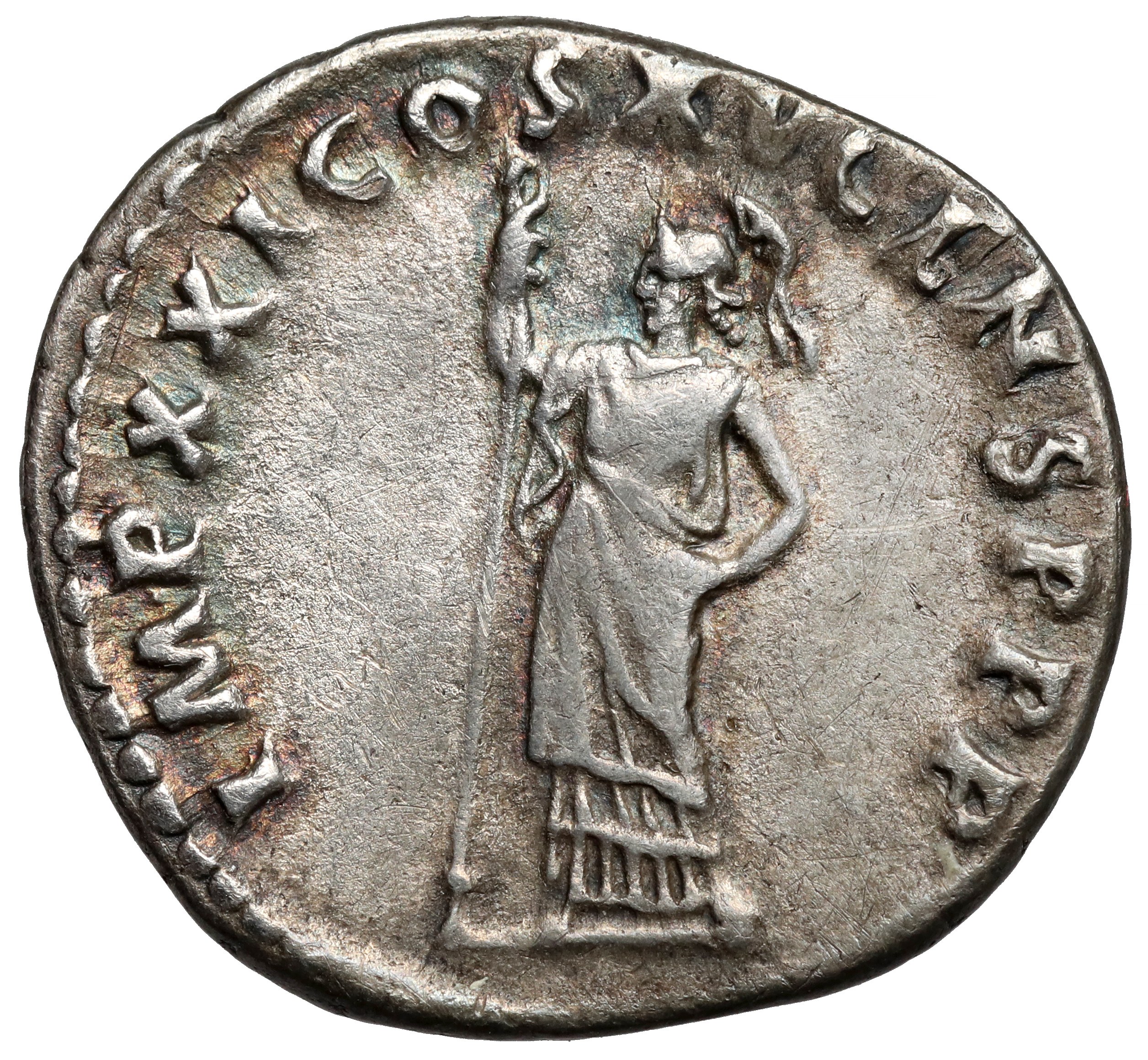 Rewers: Minerwa stojąca w lewo, trzymająca włócznię, w otoku legenda IMP XXI COS XV CENS P P P