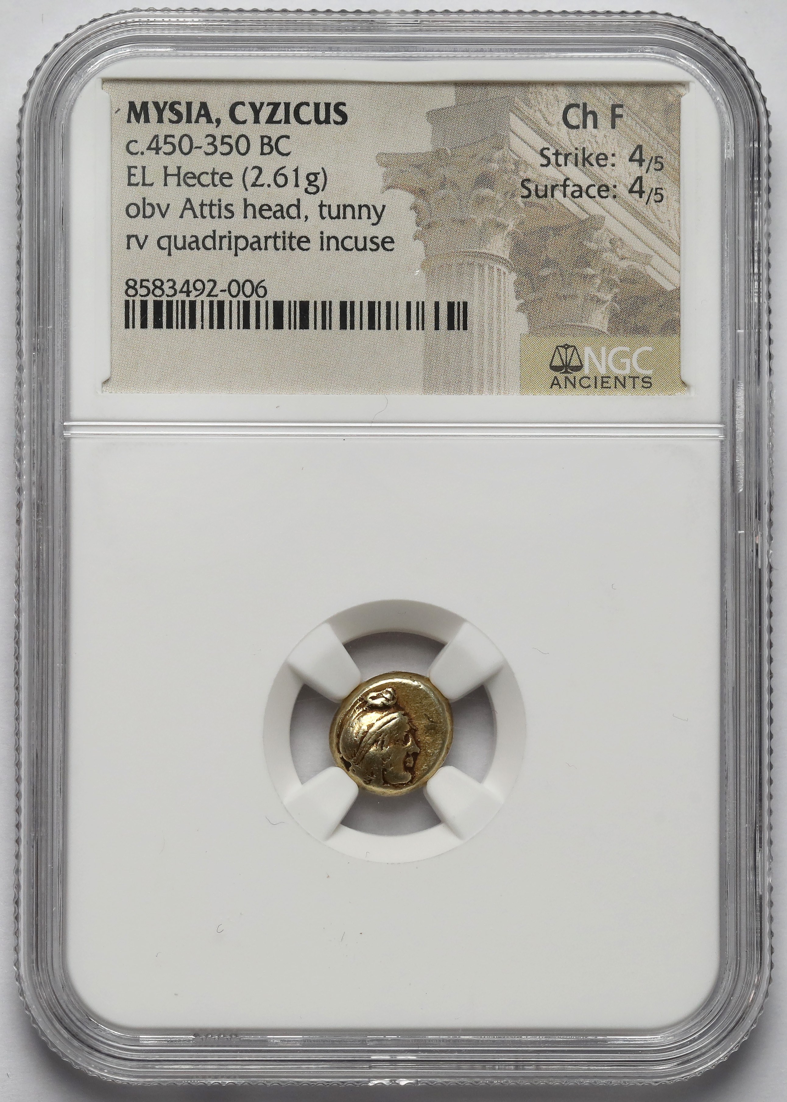 Awers: Głowa Attisa w prawo, poniżej tuńczyk.
