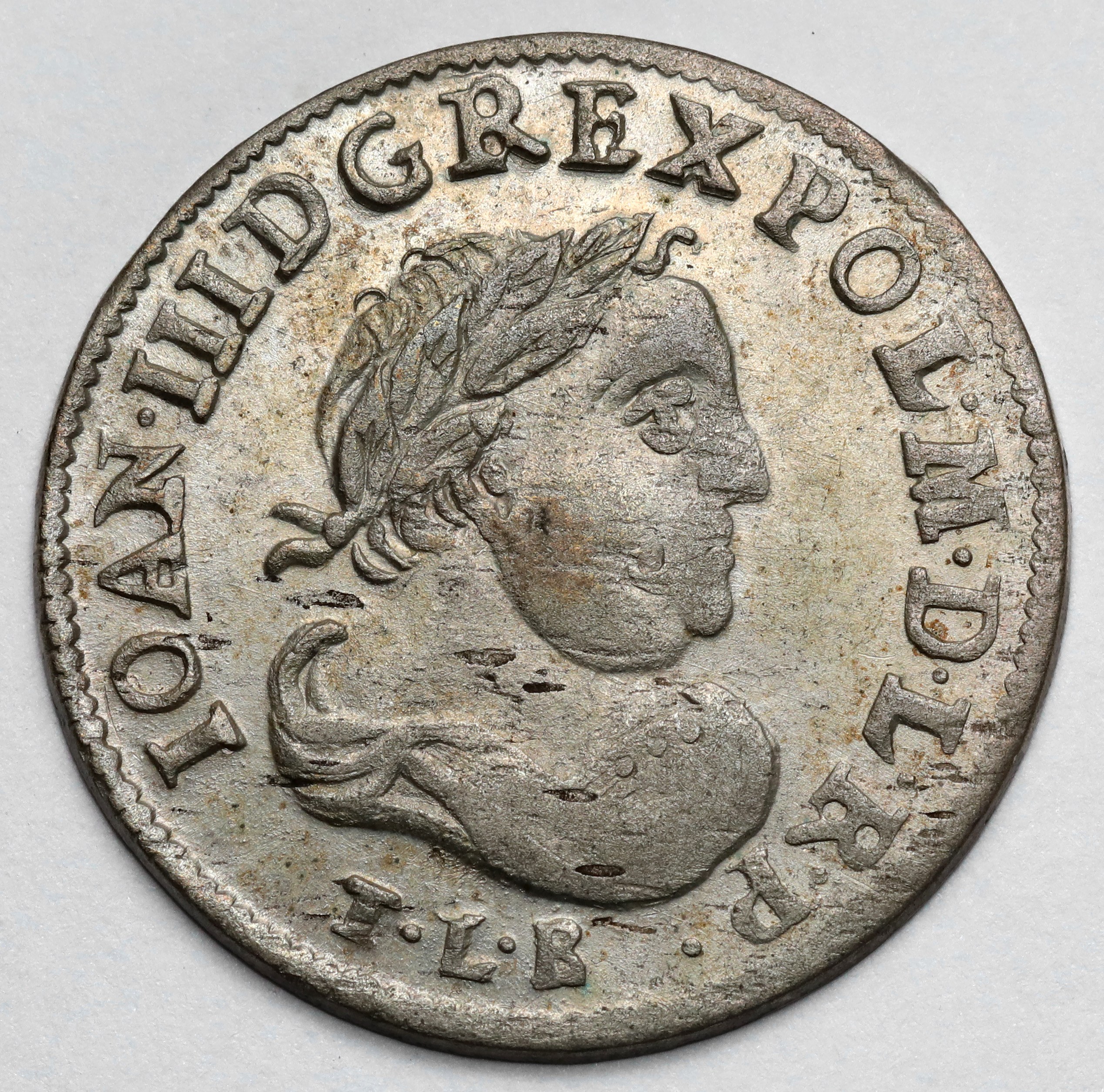 Wczesny typ z inicjałami T.L.B. pod popiersiem króla. Będący emisją z okresu przed przejęciem mennicy w lipcu 1684 roku od Boratinich.