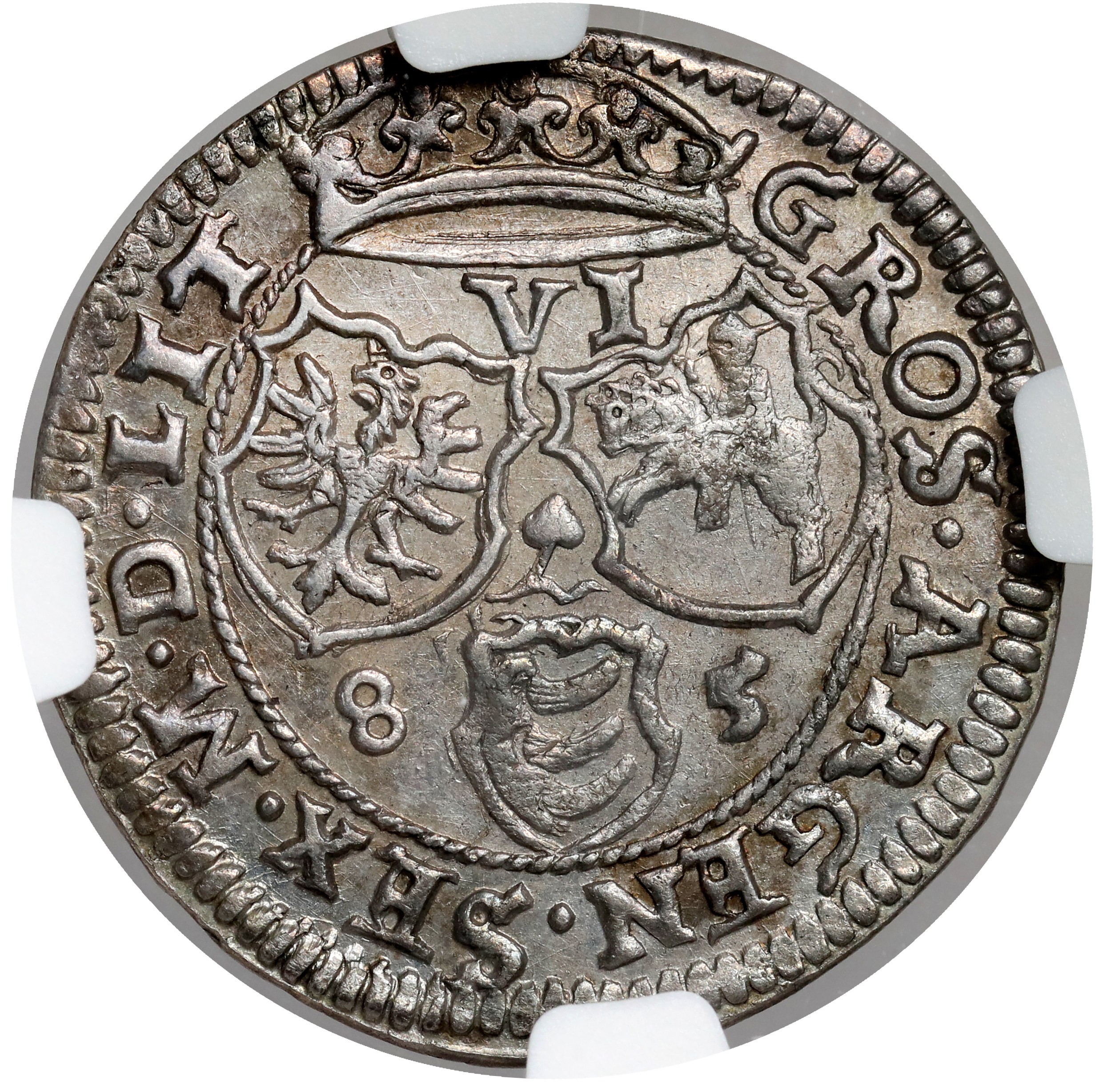 Rewers: tarcze z herbami Polski, Litwy i Batorych pod koroną i nominałem, z datą 8-5 po bokach i listkiem pomiędzy. W otoku: