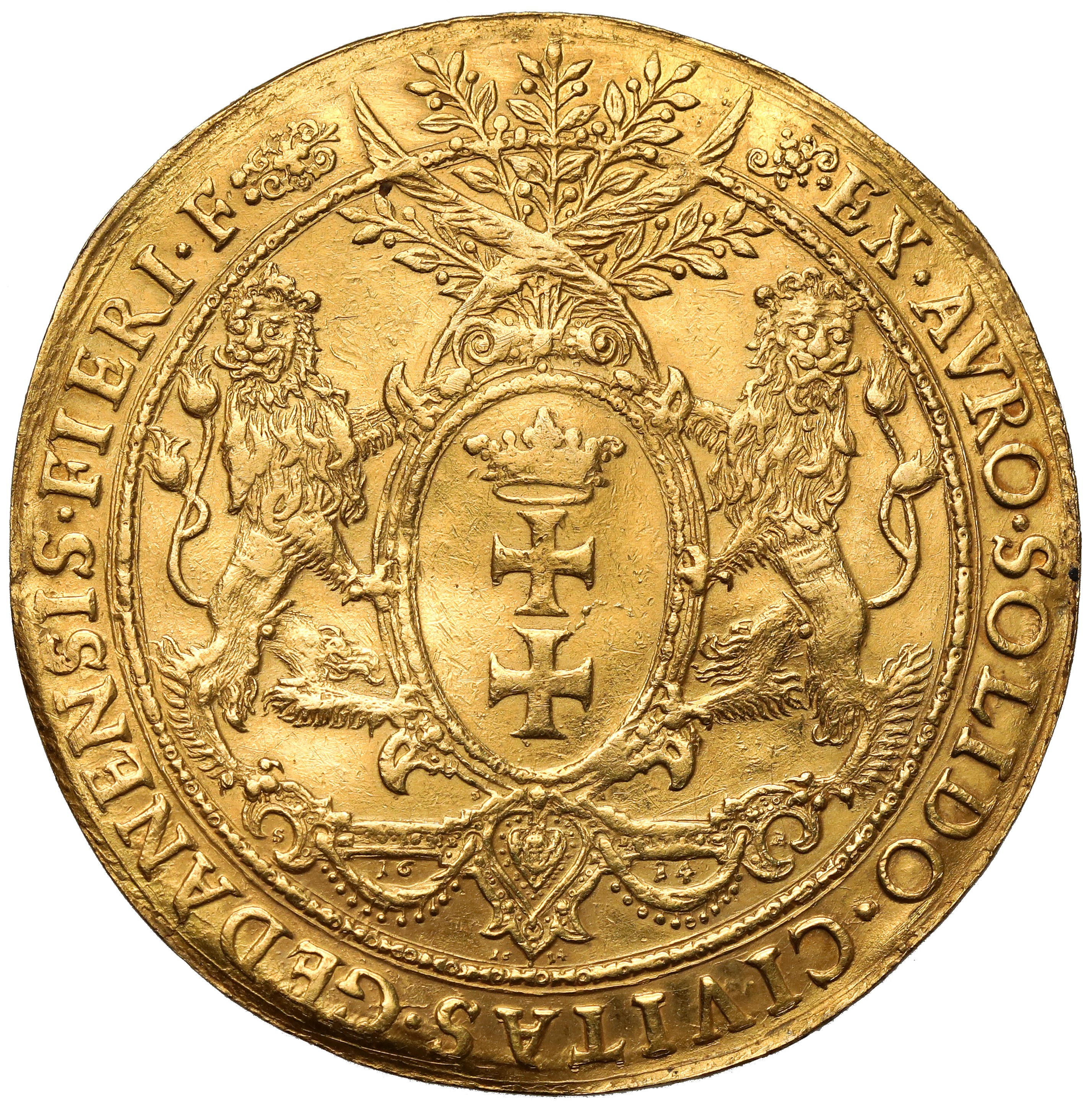 Rewers: dwa lwy podtrzymujące owalny kartusz miejski, stojący na bogato zdobionej konsoli. Nad tarczą bogaty wieniec palmowo-laurowy. Pod nią piękna konsola z mieszczonymi mikrodatami, inicjałami i napisami. W otoku EX AVRO SOLIDO CIVITAS GEDANENSIS FIERI F.
