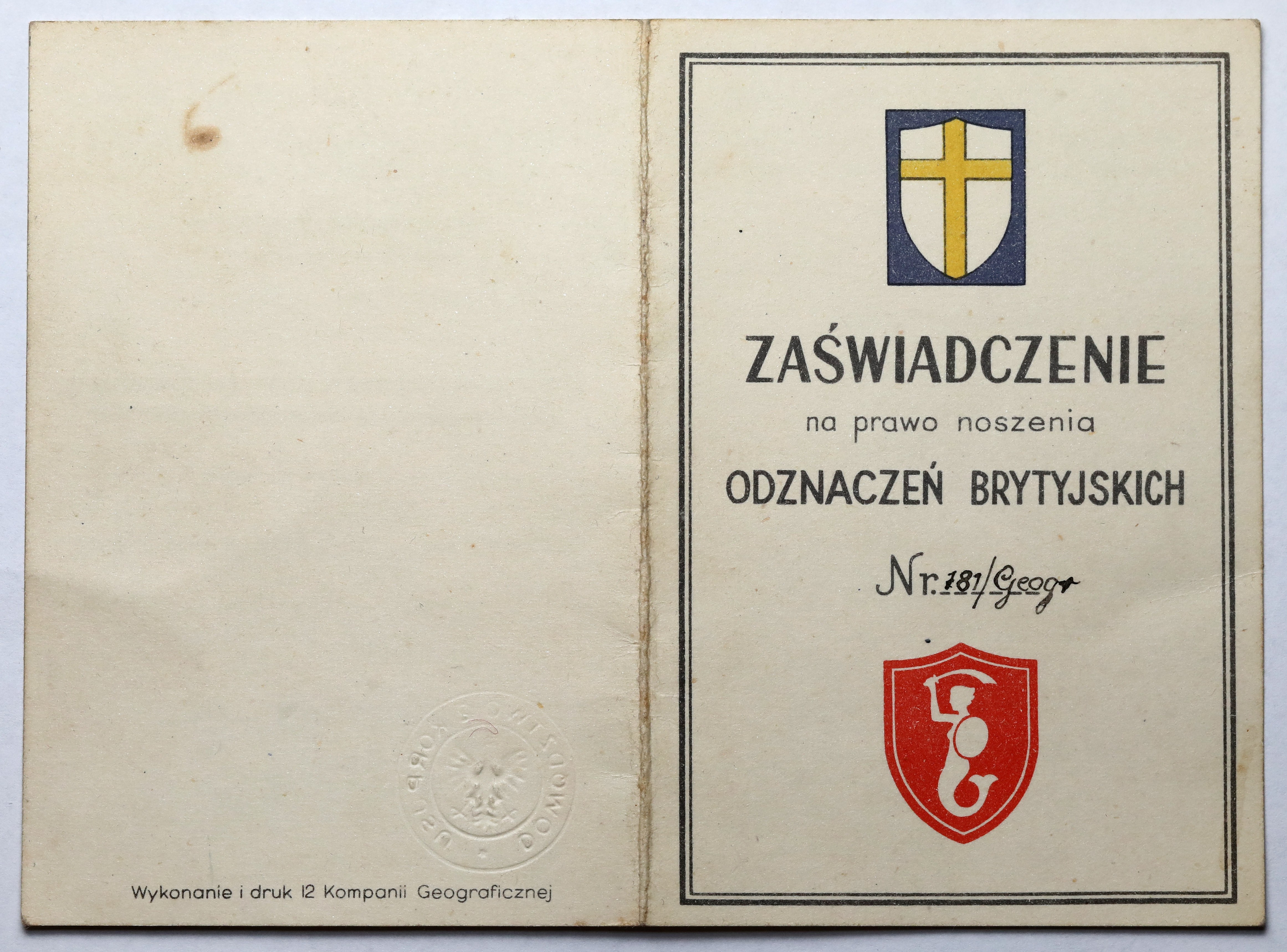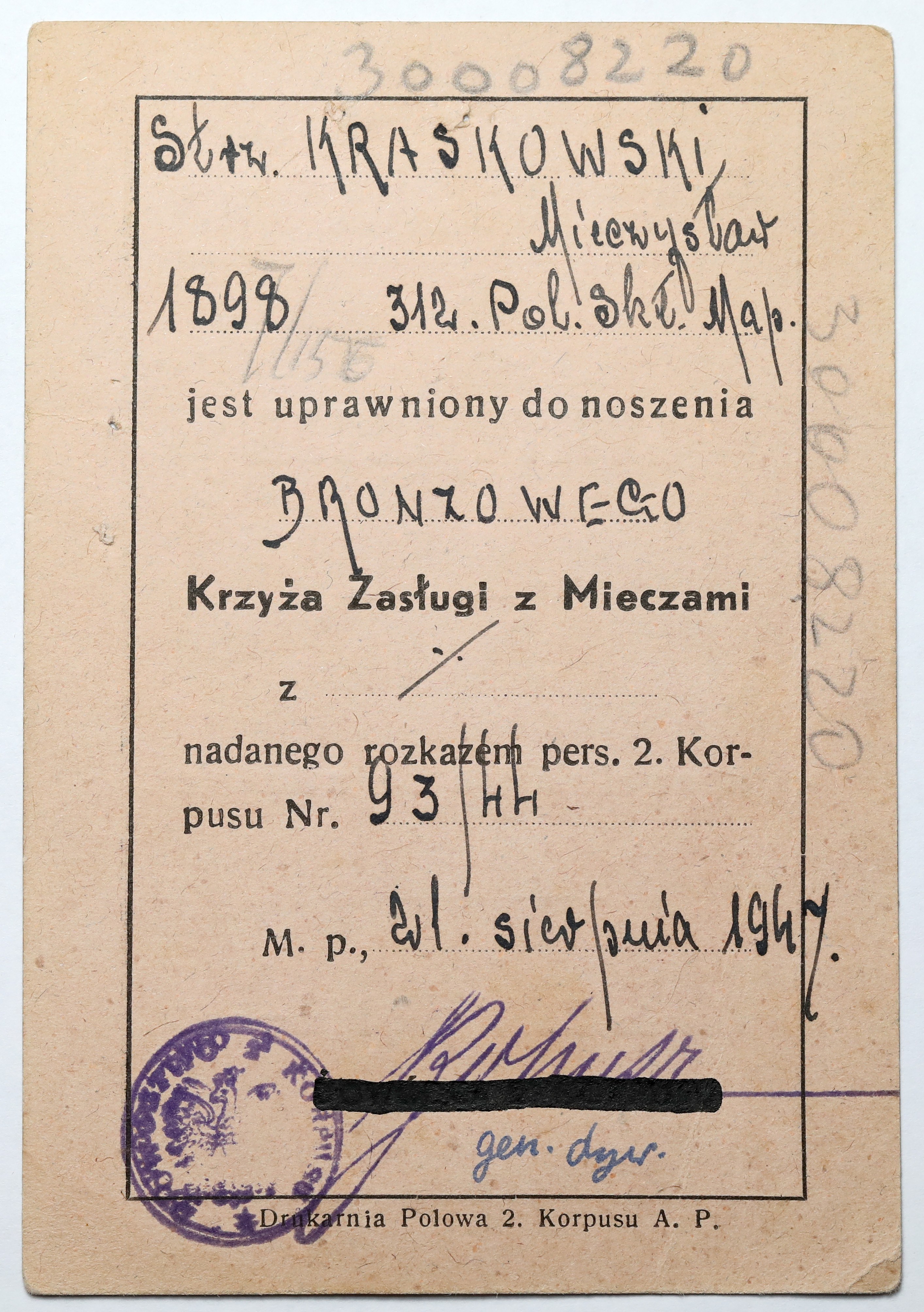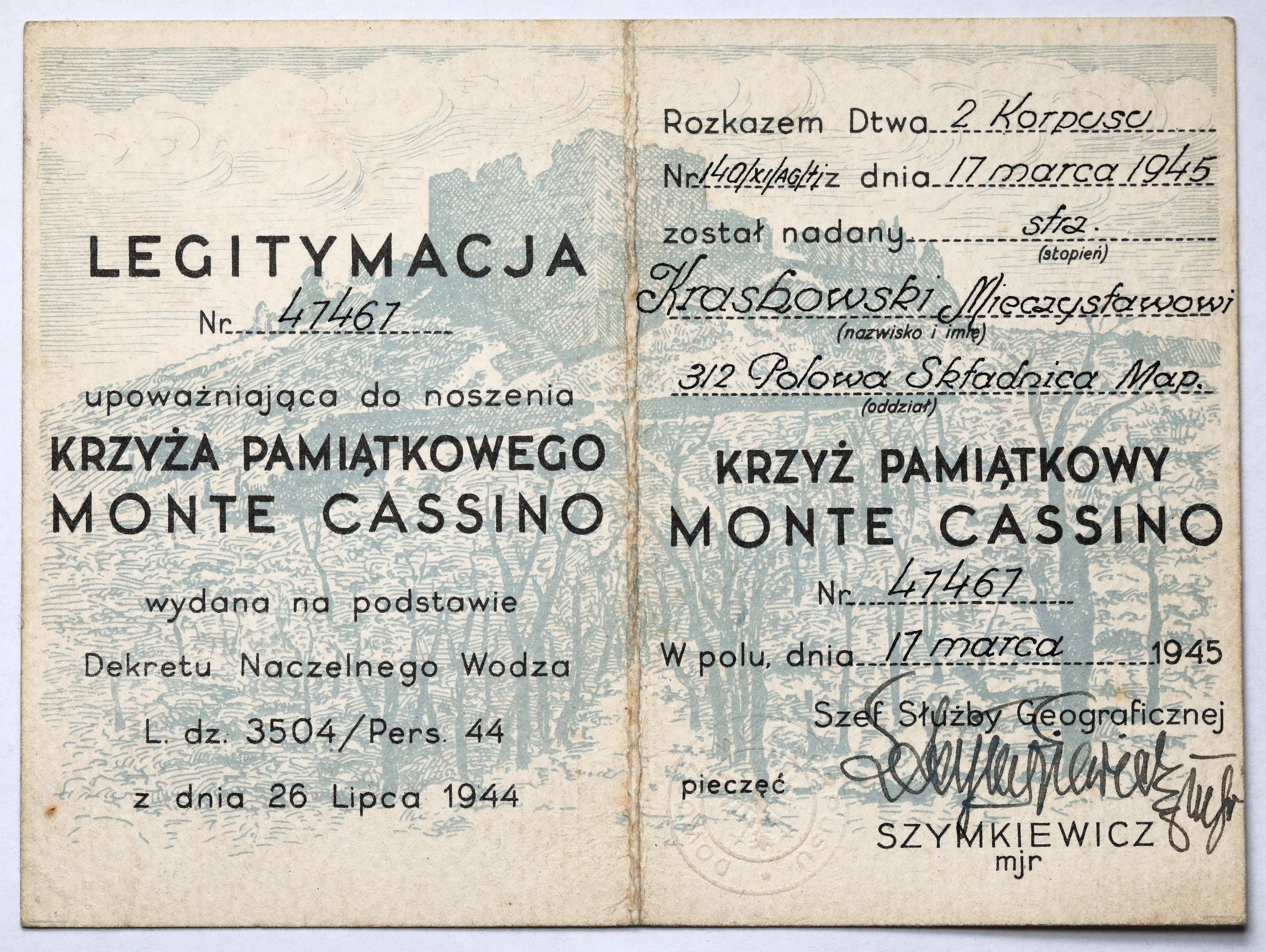 - Krzyż Monte Cassino (wtórnik) + legitymacja,