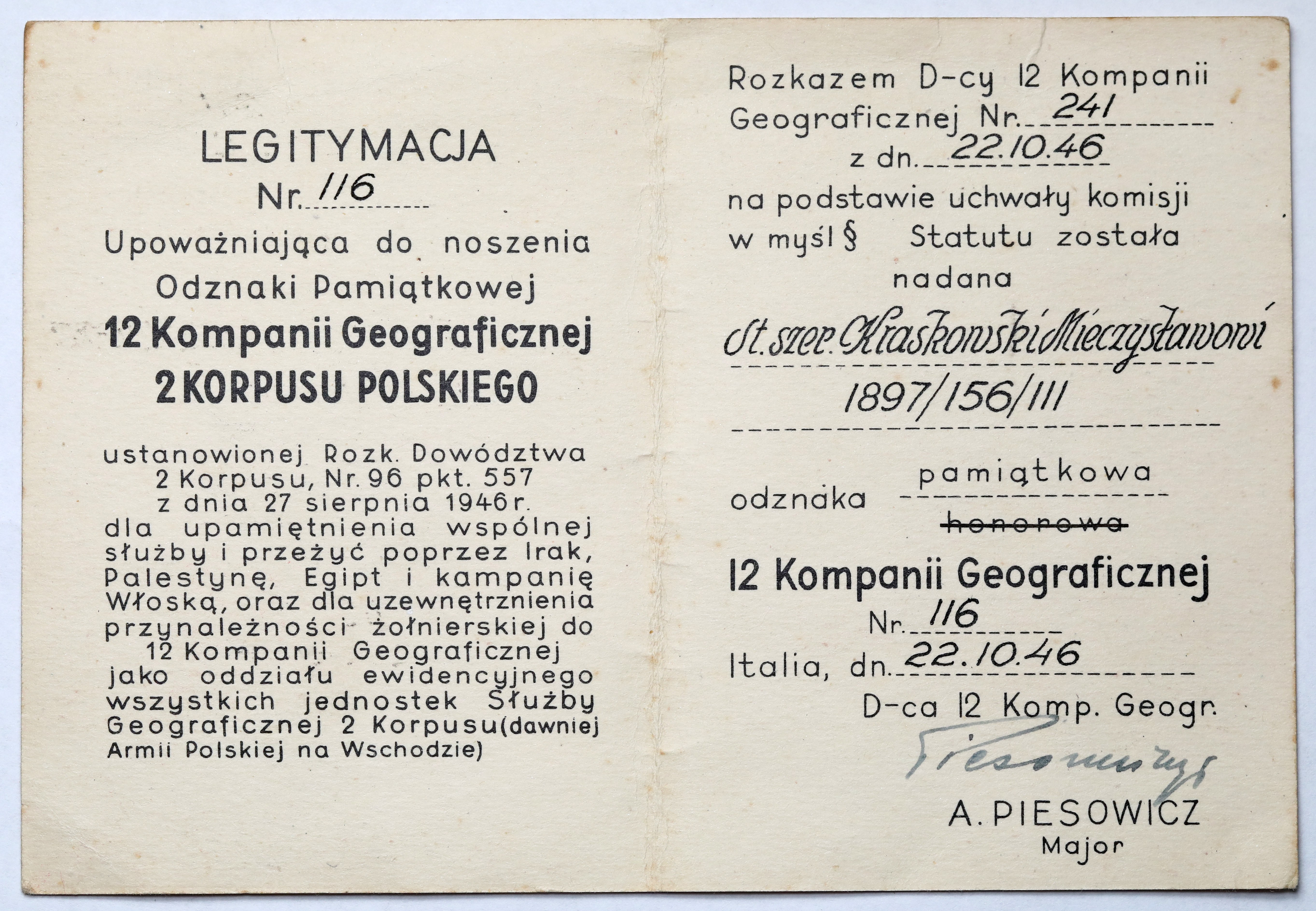 - Odznaka, 12 Kompania Geograficzna 2 Korpusu + legitymacja,