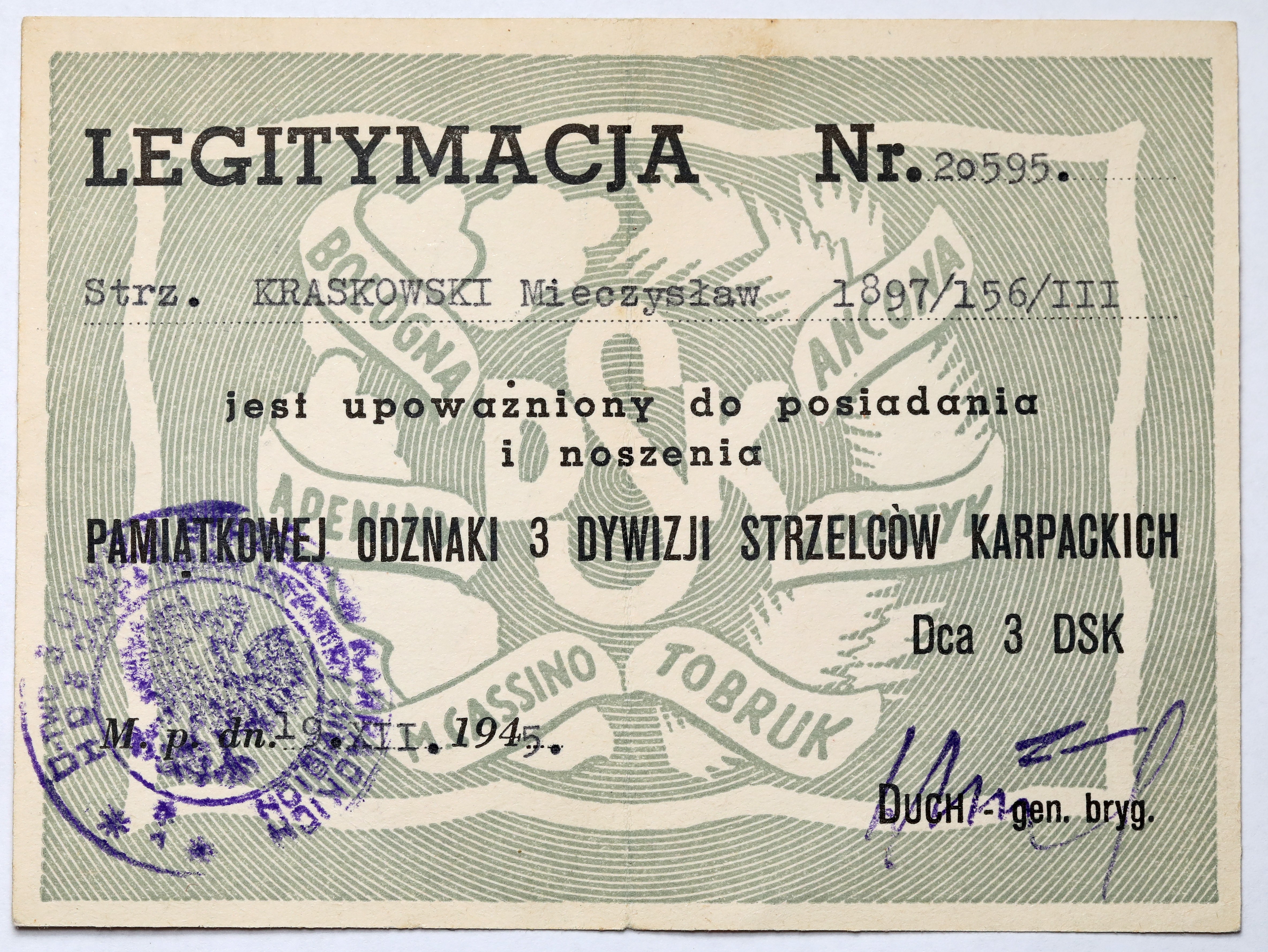 - Odznaka, 3 Dywizja Strzelców Karpackich (w srebrze) + legitymacja,