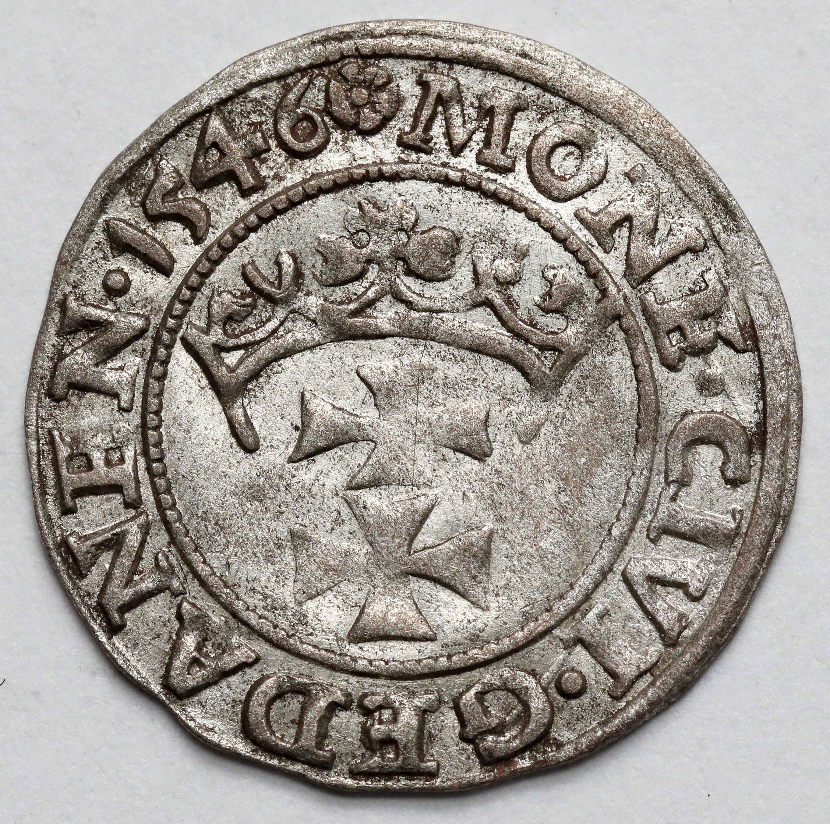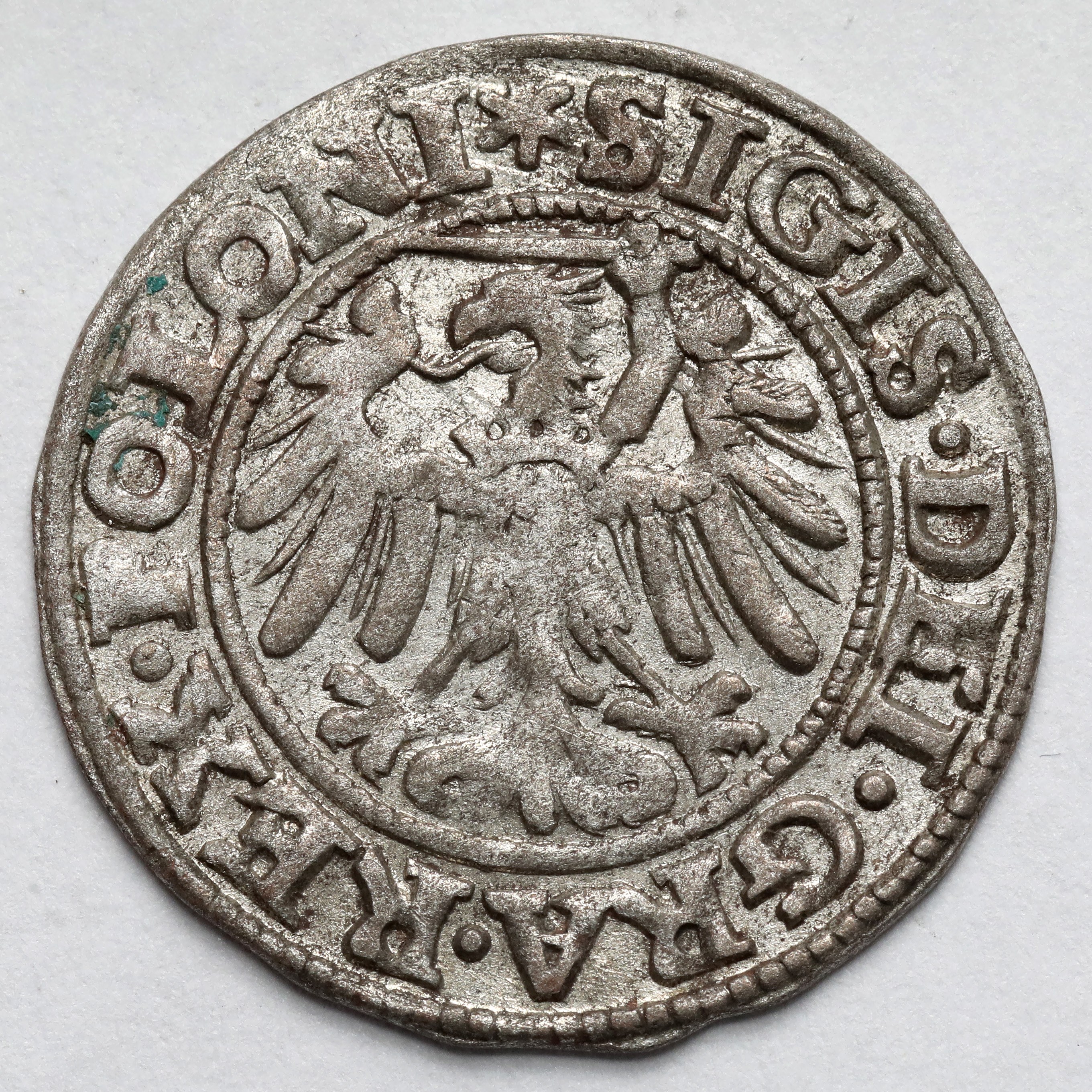 Późny rocznik szelągów Zygmunta I, wybity po wznowieniu działalności mennicy (zawieszonej w 1540 r.).